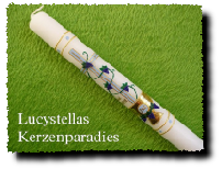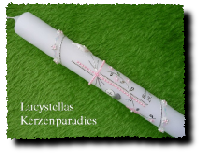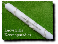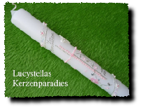 Alle auf dieser Seite bereitgestellten Informationen und Gestaltungselemente sind urheberrechtlich geschützt. Jegliche Vervielfältigung der auf diesen Seiten zur Verfügung gestellten Texten, Bildern und Grafiken bedarf der ausdrücklichen Erlaubnis des Unternehmens oder des Autors in Schriftform. Das Urheberrecht des Autors bleibt unberührt. Das Nutzungsrecht liegt bei dem Herausgeber und darf ohne schriftliche Genehmigung nicht an Dritte weitergegeben werden. Alle Texte ohne Autorenangabe unterliegen dem Urheberrecht des Herausgebers. Ebenfalls untersagt ist jegliche Vervielfältigung auf andere elektronische und nicht elektronische Medien. Die Verwertung und Vervielfältigung dieser Bild- und Textdateien ohne schriftliche Genehmigung von "Lucystellas-Kerzenparadies" oder "Andrea Weigand Kerzendesign" ist untersagt (§ 72 i.V.m. § 2 Abs. 1 Nr. 5 UrhG) und wird strafrechtlich verfolgt.